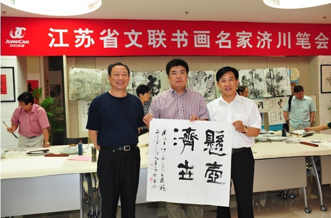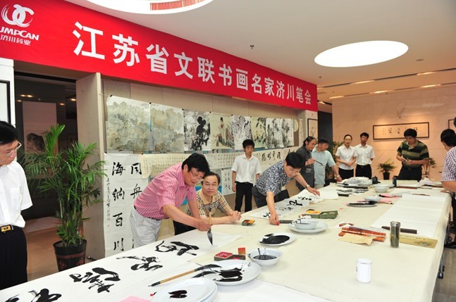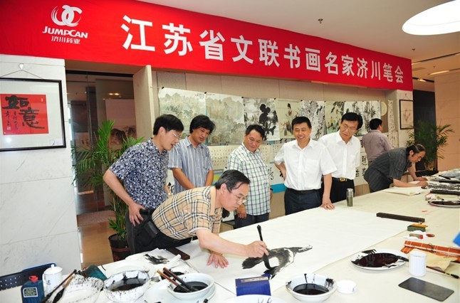 7月12日,江蘇省文聯(lián)黨組書記、常務(wù)副主席王慧芬、省美協(xié)秘書長尹石、省書協(xié)副秘書長李嘯、省文聯(lián)組聯(lián)部主任陳曉白、省文聯(lián)大型活動部主任薛彪一行11名書畫名家蒞臨濟(jì)川藥業(yè)集團(tuán)書畫院考察指導(dǎo),并激情揮毫留下珍貴墨寶。泰興市市委副書記、政協(xié)主席張澤民和濟(jì)川藥業(yè)董事長曹龍祥以及眾多書法愛好者參加了活動。