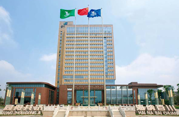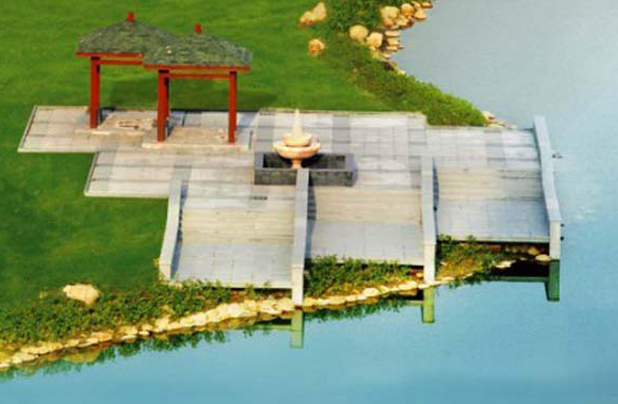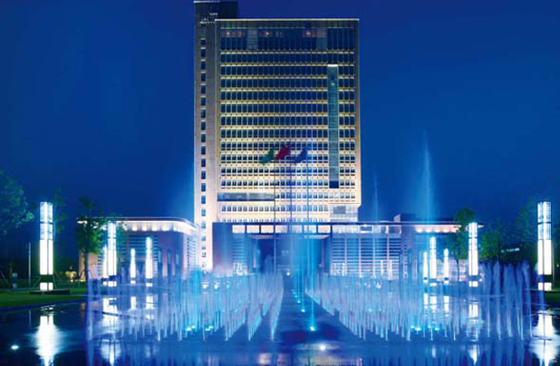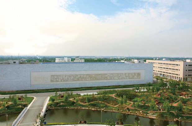 玉帶河宛如一條玉帶環(huán)抱辦公大樓,由如泰運河與長江相通,使?jié)ㄒ蛩`動。