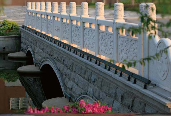 “水滿則溢”石景小品,位于玉帶河畔親水平臺上,由兩個大小不一的同心圓上下疊加而成。