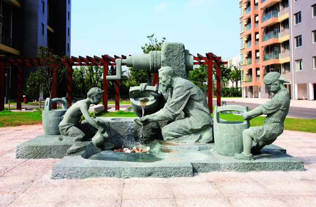 “水滴石穿”石景小品,由兩組石頭組合而成,滴水石選用天然太湖石,接水石經(jīng)長年累月水滴,石面凹陷,隱喻鍥而不舍的堅持精神。