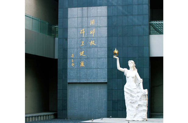 雕塑采用漢白玉精雕而成,一位少女手托圣火,背依由中國科學院院士吳孟超親筆題字“用科技捍衛(wèi)健康”文化墻,婷婷玉立在制劑樓中庭。