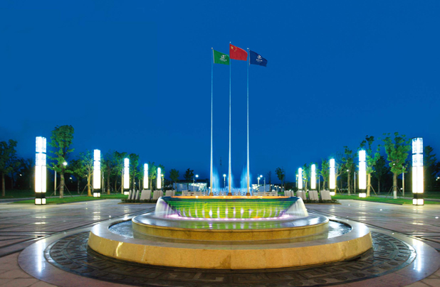 旗臺位于濟川廣場中心,大理石基座,莊重穩(wěn)固;三面旗幟,國旗居中,旗桿高20.8米;司旗位于兩側(cè),旗桿高19.98米,挺拔壯觀。